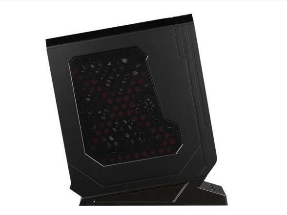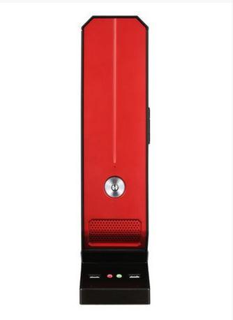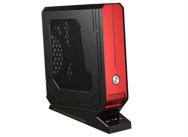 As far as design goes, the Essence is a bit more visually appealing than many other small form factor computers, featuring a slightly tilted tower construction with vented sides and a red face plate. There are two USB ports on the bottom portion beneath the speaker grille, as well as microphone and headphones ports.