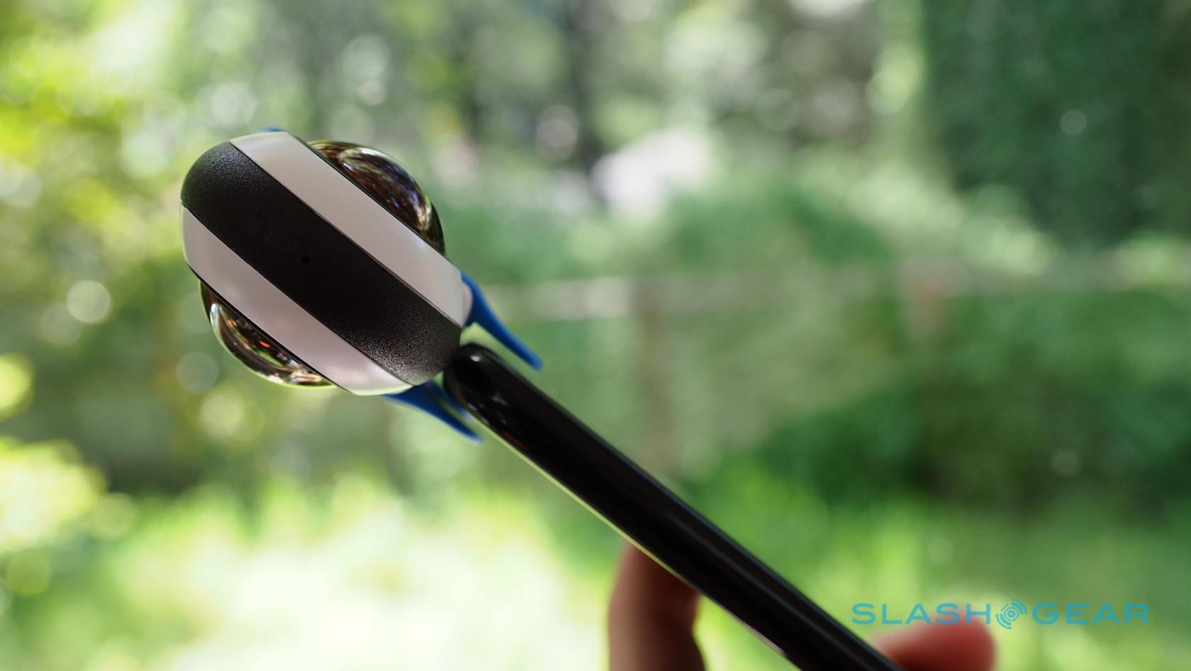 Unexpectedly, though it needs to be physically connected to a smartphone in order to work – unlike, say, Samsung's latest Gear 360, which has a standalone mode – Giroptic has included a battery. It's only a small one, at 915 mAh, though it's enough to make sure extended sessions don't entirely chew through your phone or tablet's battery. Unexpectedly, the guide-arms on the side are wide enough that I could clip it to an iPhone 7 Plus even with Apple's leather case on.