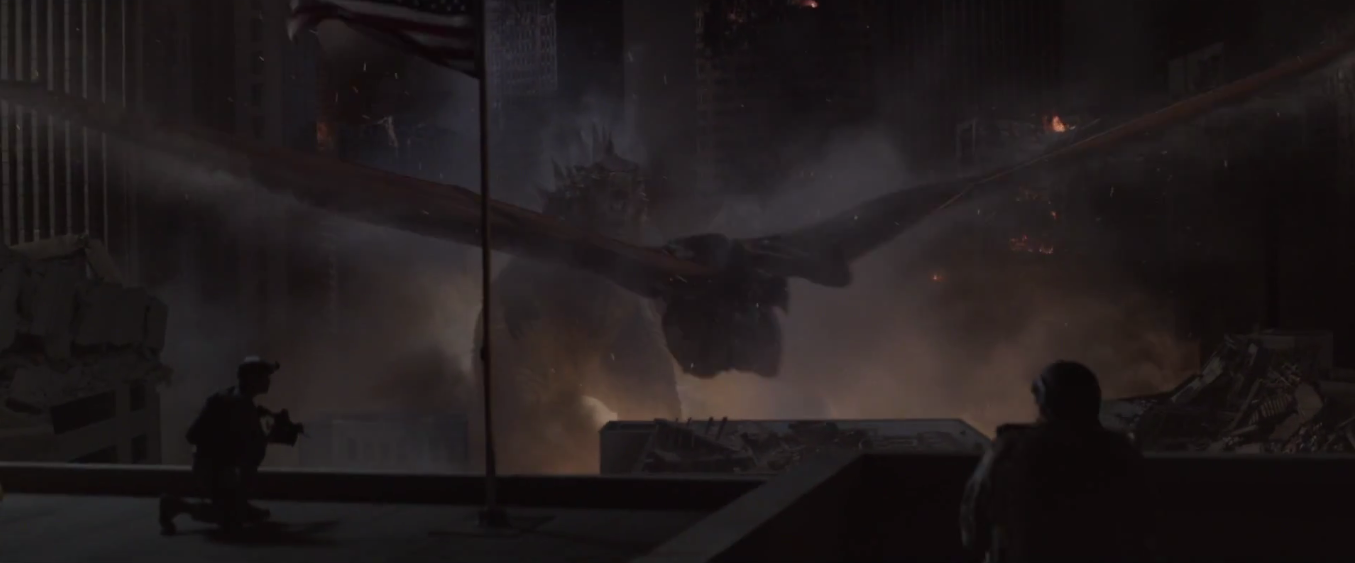 Concerning the winged creature, the question is posed, "Can you kill it?" To which the reply is succinct: "I believe something can." Godzilla is that something, the trailer suggests. "A monster?" "No. A god."