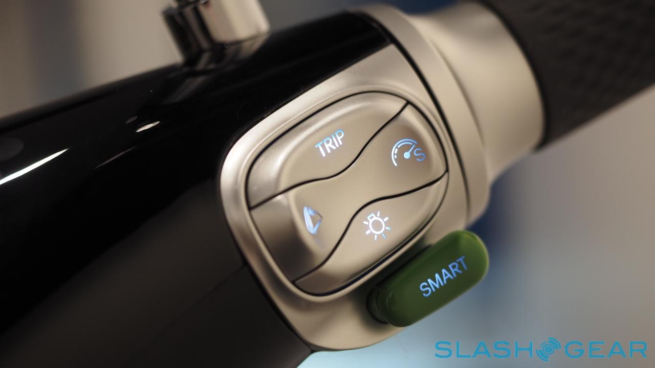 All of the lights are LEDs, from the headlights (using the same tech as in Audi's R8 and the Mercedes-Benz CLS, no less) to the turn signals, taillights, and hazards; the Smartscooter automatically powers down when the kickstand is deployed. More interesting, though, are the sensors woven through the bike, of which the digital compass, gravity, shock, ambient light, and thermo sensors total thirty in all.