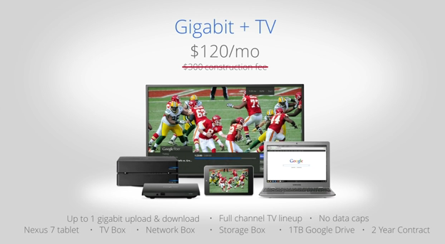There's one $300 construction fee, one time fee, and you've got a $120 a month cost. With a two-year contract you also have no construction fee at all. All of this will be live for Kansas City immediately if not soon – and once Google is ready to bring on Fiber to the whole USA, you'll have it as well. Can't wait!