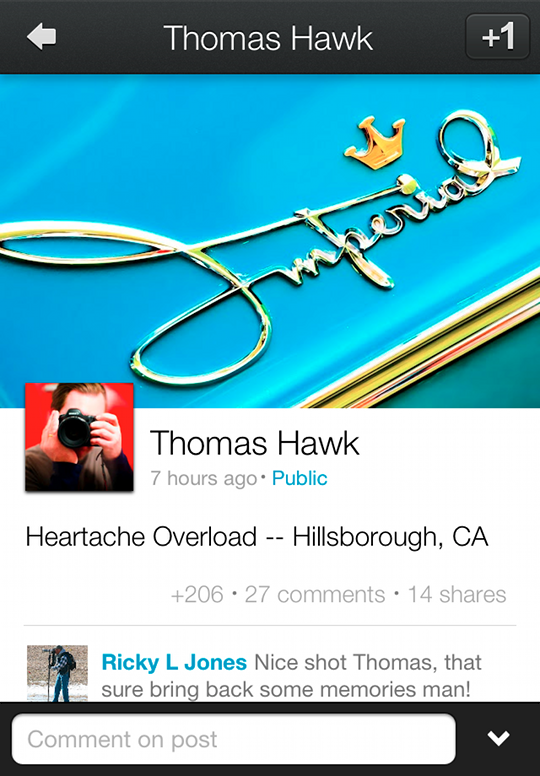"We're not interested in a mobile or social experience that's just smaller" Google says of the update. "We're embracing the sensor-rich smartphone (with its touchable screen and high-density display), and transforming Google+ into something more intimate, and more expressive. Today's new iPhone app is an important step in this direction—toward a simpler, more beautiful Google."