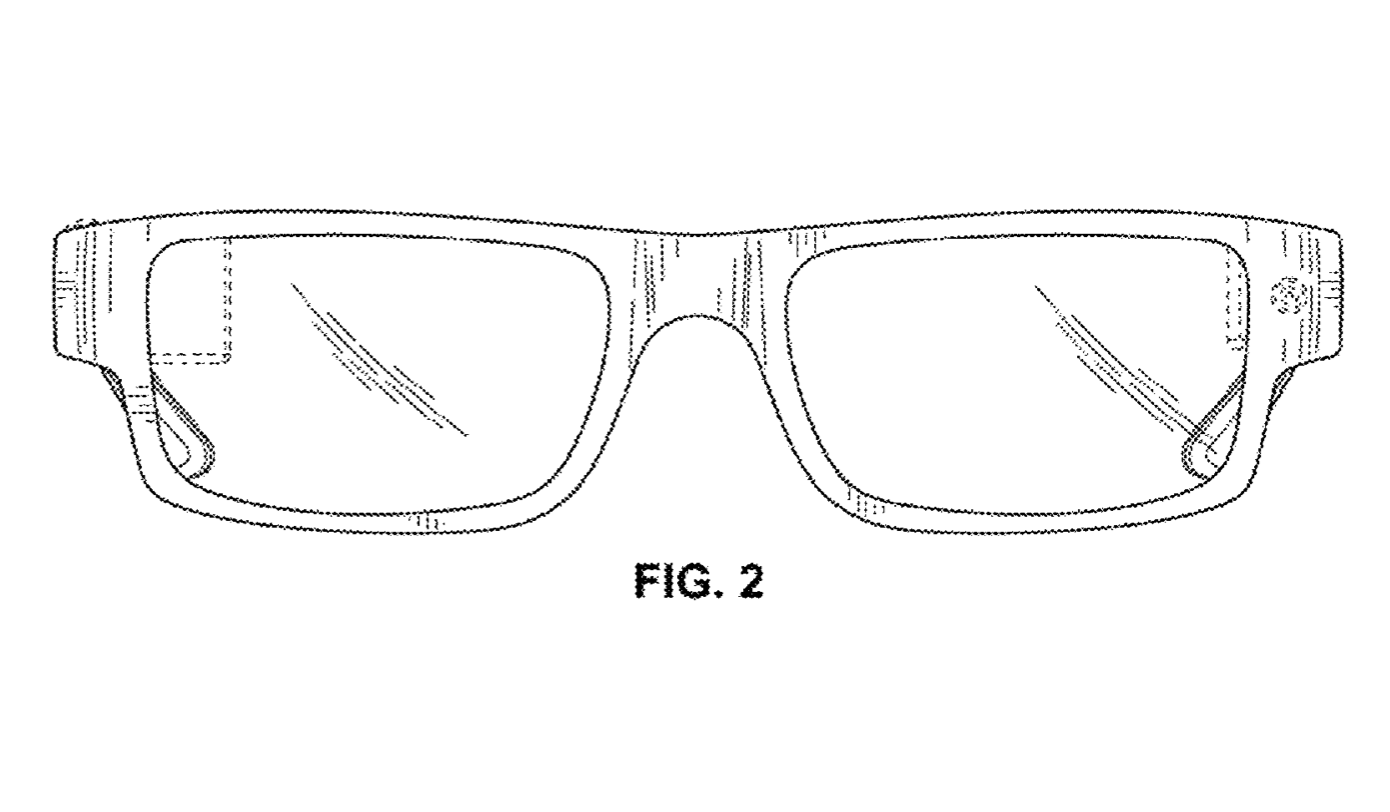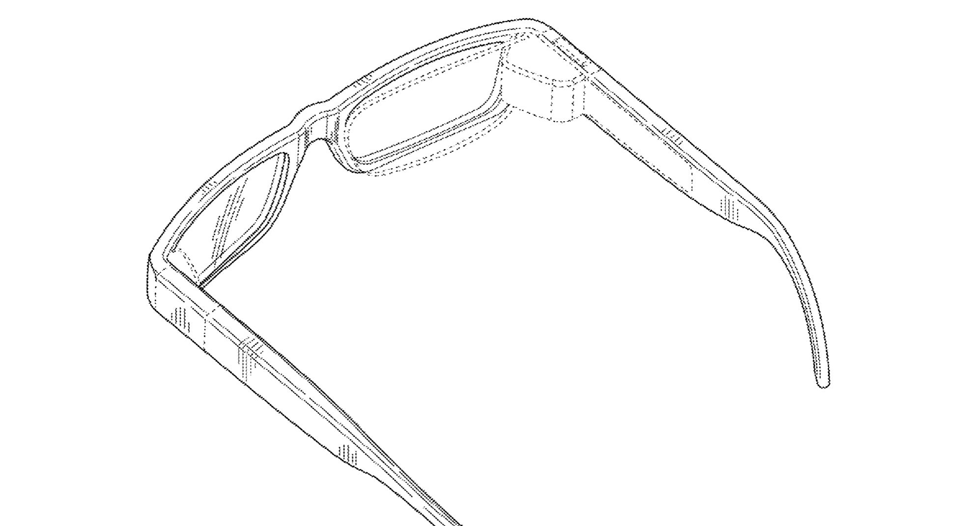 The new patent hides the offending parts, though. The small screen is tucked behind the actual frames, and looks like it might project to the entire glass eyepiece. A small hole on the other side of the frames suggests the camera may have been moved to the opposite side.