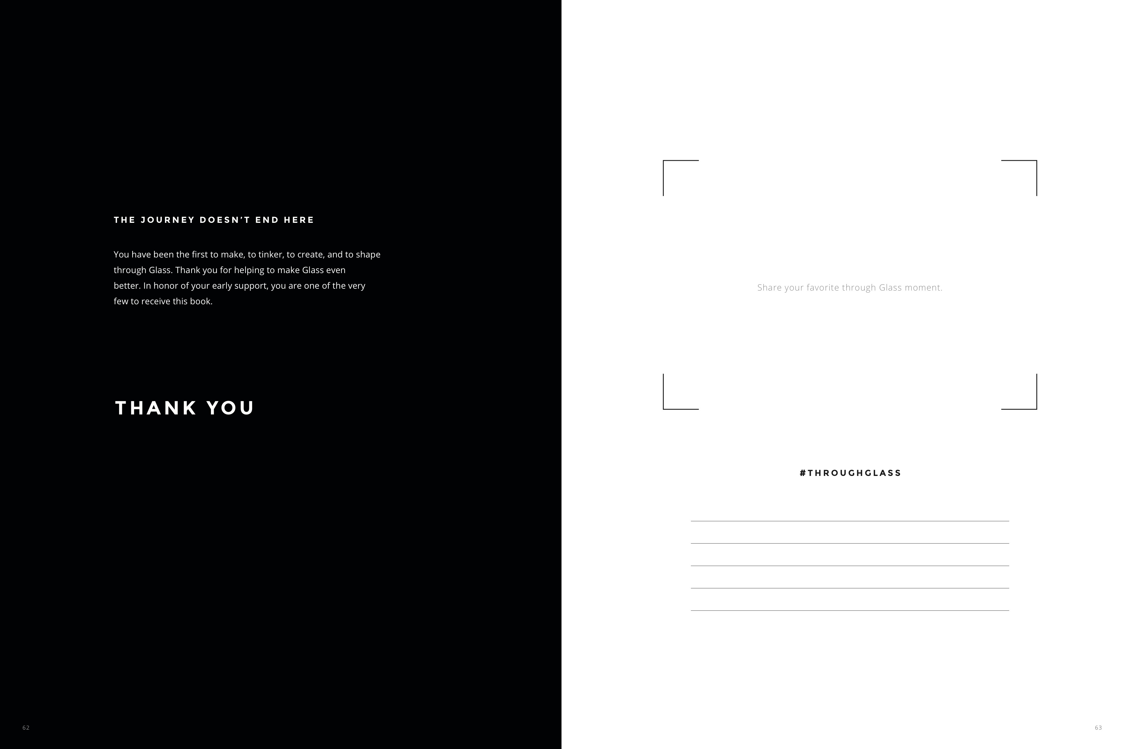 Today Google Glass Explorers were given a digital book thanking them for taking part in the first big leg of the Glass journey. This book goes by the name GLASS VOL 1, emphasizing – again – that this is not the end of the road for the smart headset, it's just a chapter marker. This book begins with an inspirational quote: "To discover new places, sometimes we need to leave the map behind." This document acts as an extensive Thank You card to users as well as a victory lap for Google Glass creators.