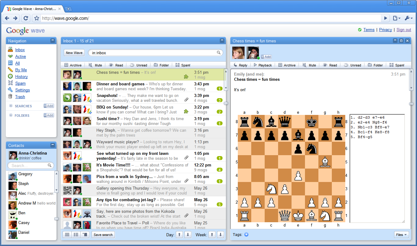 Essentially, Wave is what email would look like if it were designed today, according to Google anyway. You'll see all of your contacts in the "Navigation" side bar, which is like your buddy list. You can select to communicate with any person, online or off, and send them a message. If they're not online, you can just click below their message and reply as in GMail, except there's no additional "New Message" window to pop up or anything. You can even respond to a particular section of a message someone sent you by clicking below that portion and typing. If your friends are online, you can start typing to them, and they will see your words appear in real-time, as you type them. If you don't like that idea, you can enter into "Draft" mode and hide what you type until you're finished with it. This would enhance the communication between the two of you, and is intended to help keep the flow of the conversation.