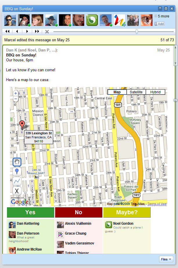 There are a boat-load more features that Wave offers, including wiki-like collaboration on projects between friends or co-workers. If someone wants to jump in on an ongoing communication, they can see how the conversation flowed by using the Playback feature which will show them all the changes that were made to the message over time. Say you want to add a friend into Wave. You can go click and drag their picture into Wave, and you're done. Even dragging photos into Wave to share them with friends is all drag-and-drop because of Gears. You can host Wave on your blog, and allow visitors to communicate with you directly on your blog through wave. The largest draw to Wave is the collaboration functionality that it offers. It can allow friends and co-workers to collaborate on projects, communicate together, send out meeting invites and track who is attending.