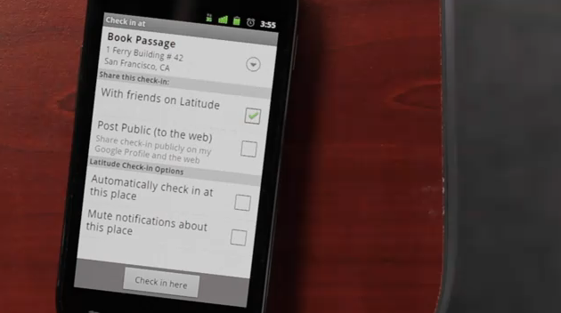 Sharing: Google is careful to note that everything in Latitude is 100% opt-in, from sharing your location to allowing your location to be automatically shared. Share with the whole world, your friends only, or just with yourself. Coming later this week you'll be able to see your whole history of check-ins at google.com/latitude on your computer.