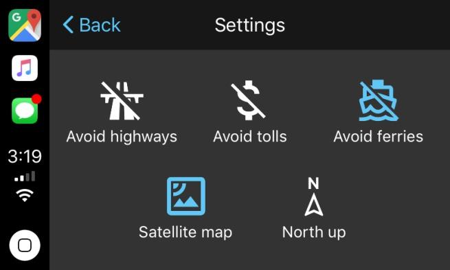 That means that Google Maps in iOS 12 CarPlay will show a familiar blue arrowhead overlay and the same map tiles that Google Maps users have been accustomed to. That works for both cartography and satellite modes. However, the rest of the interface, from settings to toolbar will be consistent with the old CarPlay Apple Maps UI. Best of both worlds, perhaps.