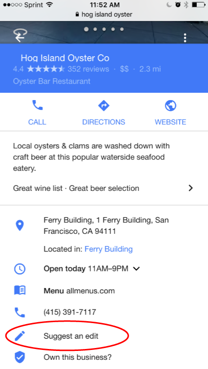 This update includes several new buttons for adding or editing locations in Google Maps. If you're inside a location's listing – a location such as a restaurant, for example, where a user is the owner – and and they want to make an edit to the information provided, they can. They'll find the button "Suggest an edit" under open hours and phone number listing.