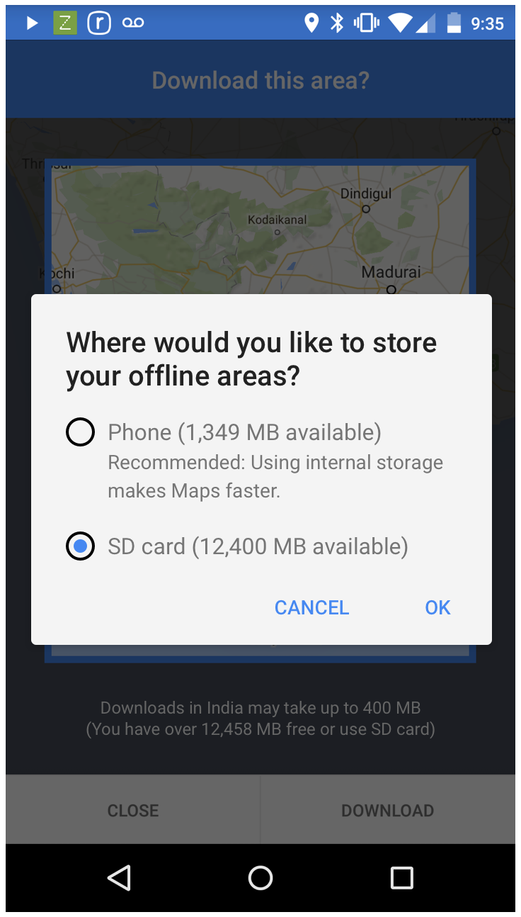 Maps users who are having an issue with storage space, but don't want to start deleting photos and apps will like this next feature. Offline map areas can now be downloaded to an external SD card for devices that have a SD card installed. When downloading these offline areas, if you have a memory card installed, you can choose whether to download to the phone or the memory card and Maps shows how much space you have in each place.