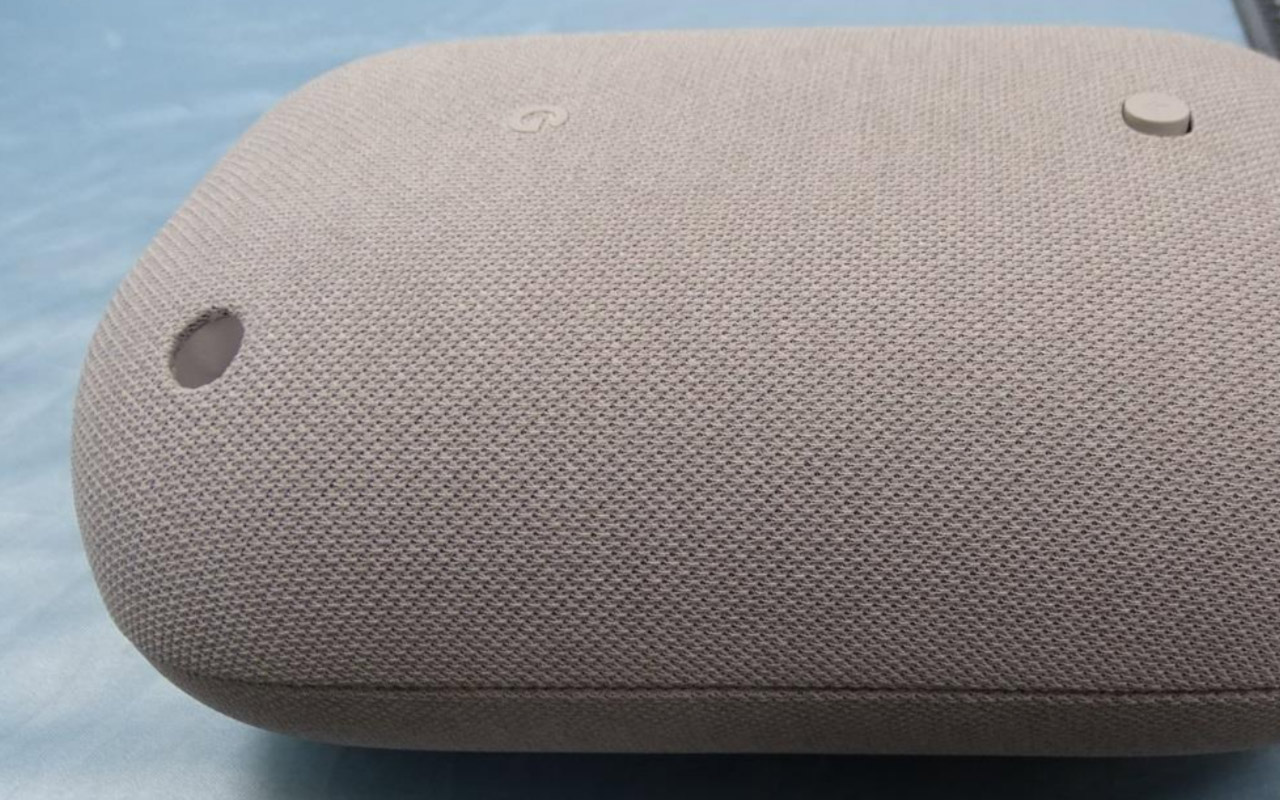 The Google Nest Home – as it might well be called – looks a bit like a pillow. It's approximately the size of a small purse, or a clutch, and it rolls with a single 30W DC power supply. This hardware will likely be released in several different colors, but here it's shown in standard white/gray.