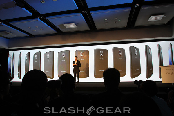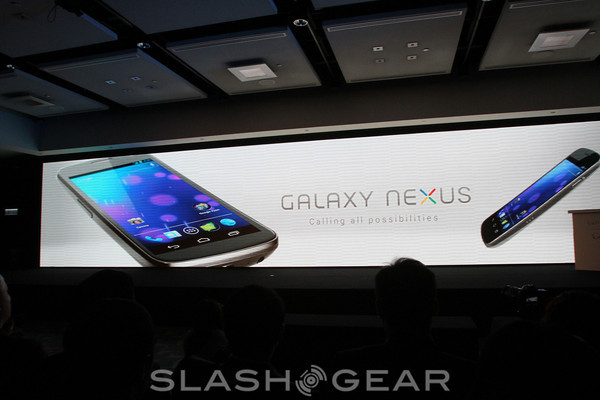 Then came the video of the Galaxy Nexus, a short video showing off the device flying through the air, this complimented by Andy Rubin and JK Shin then stepping back onto the stage for a photo opportunity holding the device aloft. Kevin Packingham of Samsung was up next, there to speak about the innovation in the device.
