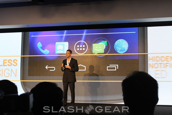 Samsung's design legacy, says Packingham, is utilized here, especially in the contour display (the curve) with a soft, natural feel. The device is thin at 8.49 mm and has a 4.29 mm bezel around the edge. There's a new Hyperskin backing on the battery cover which makes the back "slip resistant" and there's an LED notification light below the display hidden under the black. The camera has the ability to use built-in stabilization and 1080p video capture. There's a built-in Barometer for weather, and the dock will be a simple drop-in design.