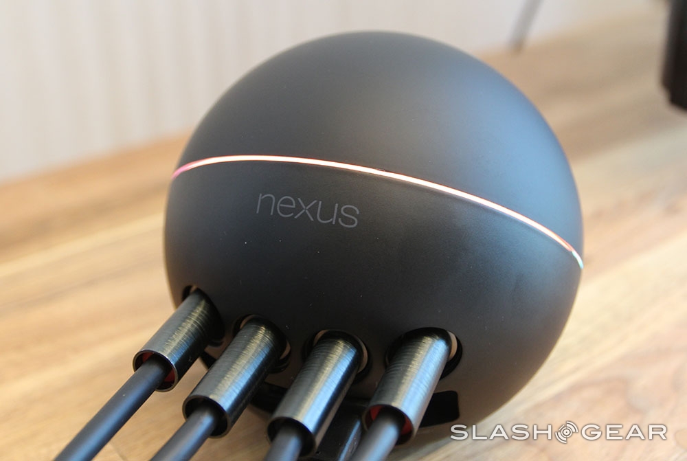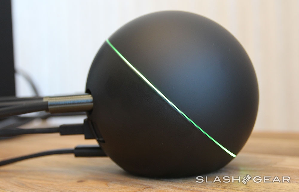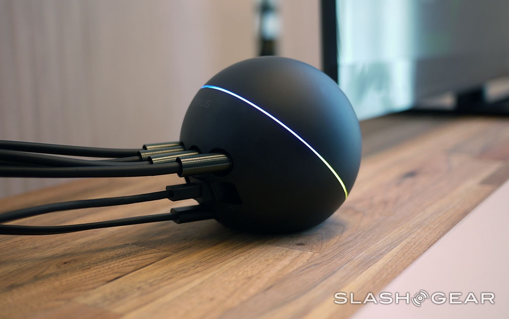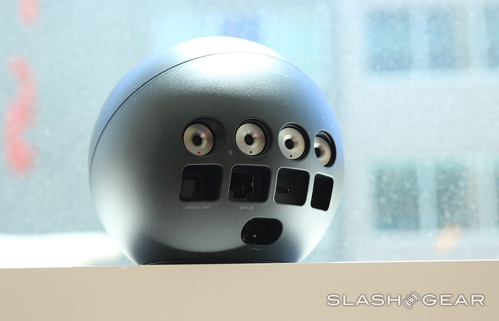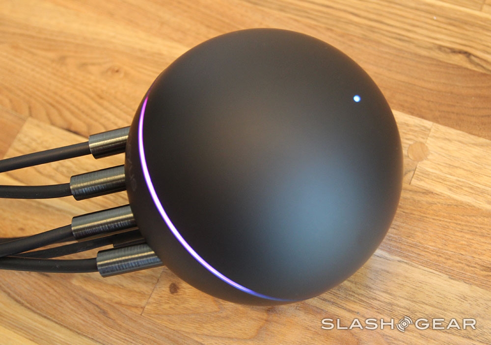 What you've got here is a magical looking undeniably heavy little spherical device that's got half a sphere dedicated to turning the volume up and down (as well as a few other functions) that's accented with a bit of color-changing action as well. This device connects to a series of audio and video outputs including 4-channel speaker-system devices and 1080p HDMI devices as well. You'll be able to have several devices adding songs or videos to a list or you can control the device with one device on its own.