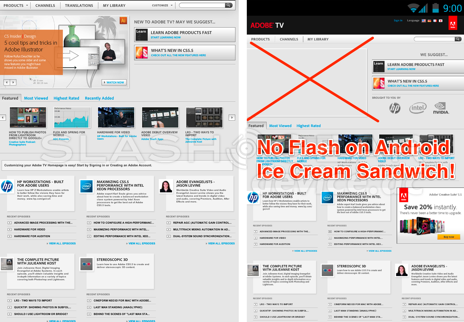 If you lucky owners of the Galaxy Nexus in these first days of its release complete with the first iteration of Ice Cream Sandwich, you'll notice that you do not have Adobe Flash Player installed, nor do you have access to a download on the Android Market – Google has just confirmed with us that this is normal and that Flash support will only come once Adobe makes the call to update the mobile version for Android 4.0. You currently will not have the ability to load either a new version or one of the older versions of Flash Player for Ice Cream Sandwich until Adobe makes the call to update their app to be compatible with this newest version of Android. Don't get too frazzled quite yet though, that's not the whole story.