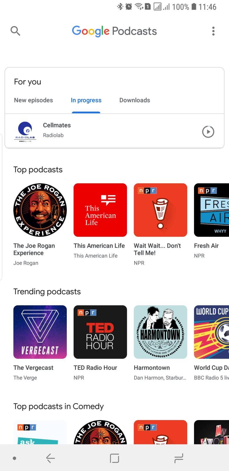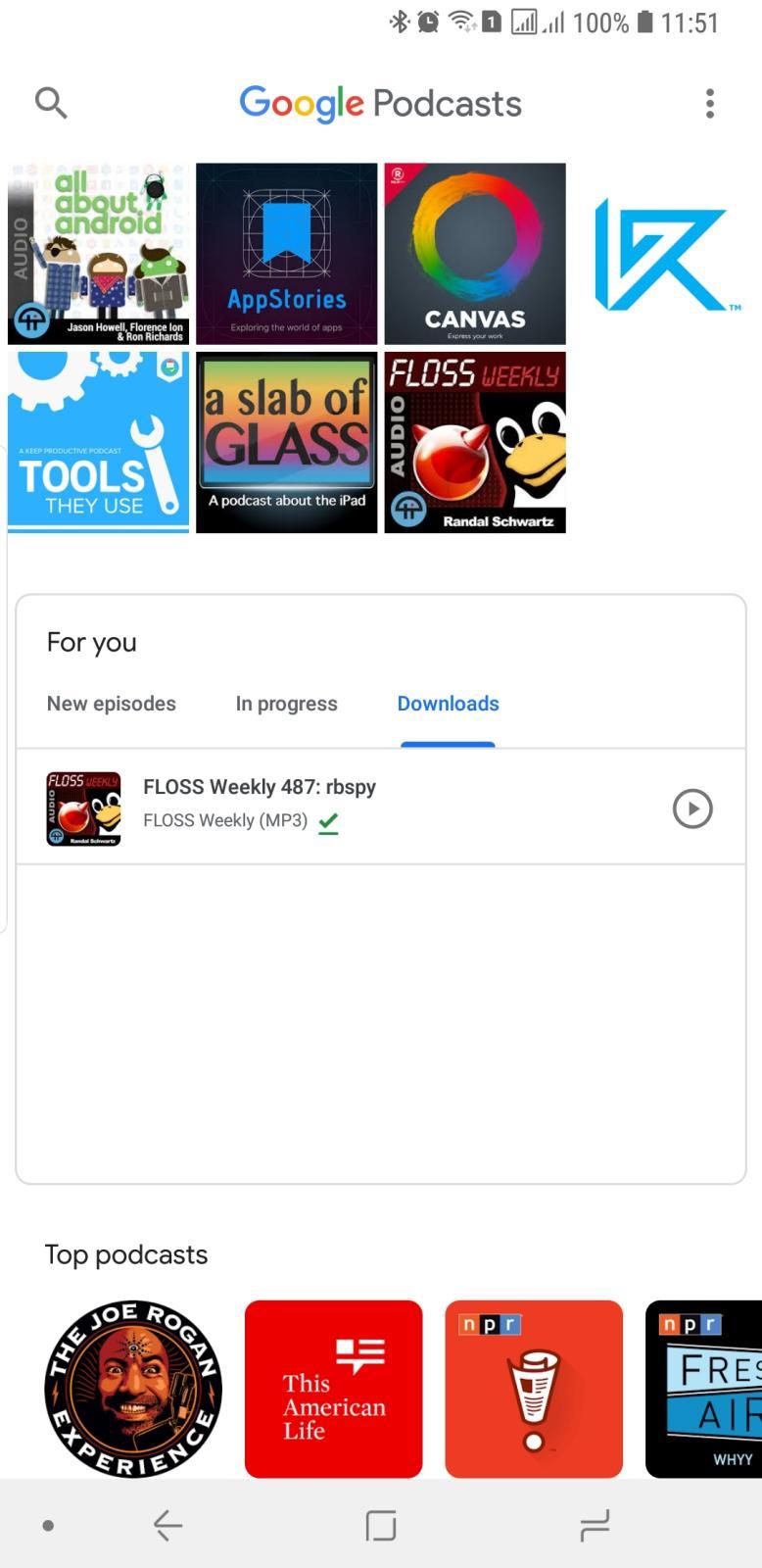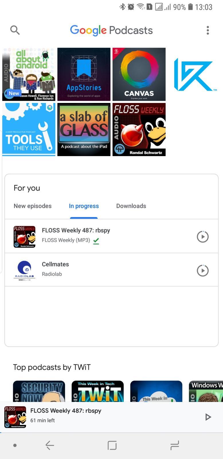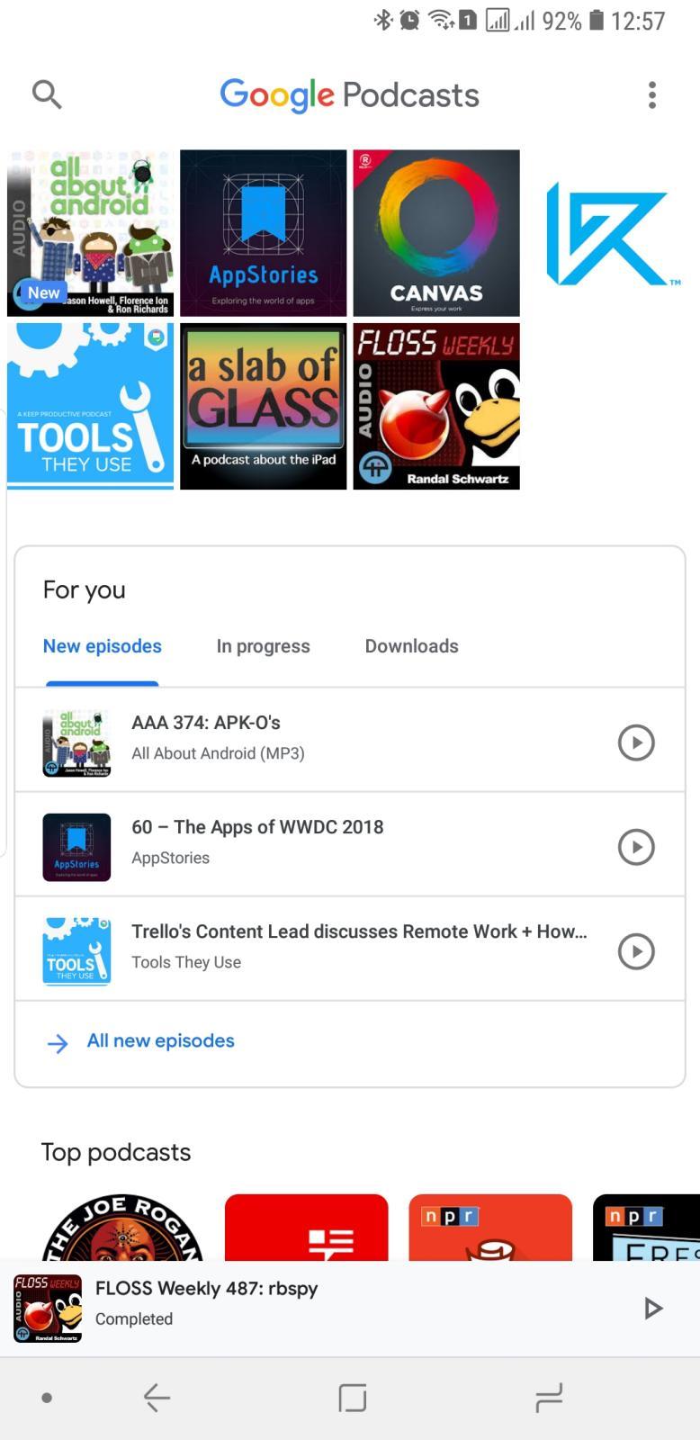 The app literally puts your content over and above Google's recommendations. At the very top is a grid of podcasts you've subscribed to. Below it is a "For you" card with tabs for New Episodes, podcasts In progress, and Downloaded episodes. Only then does the almost never-ending stream of recommendations follow.