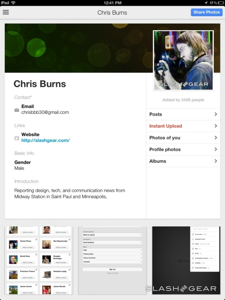 You can share photos to Events, turn on instant upload to instantly upload photos from your iPad or iPhone to Google+ automatically, and check out your Nearby stream to see which contacts of yours are physically near to you – and what they're doing at the moment. You'll be able to check this app out right this minute, if you do so please, in the iTunes App Store. It's there for free, of course, and is up for download starting today.