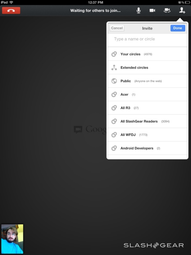 Then there's the Hangouts situation – you certainly can hang out with your friends using your own front facing (or back facing) camera on your iPhone or iPad, but that's about it. You wont be watching YouTube videos or editing documents from this app in this iteration. It's also rather plain looking if you've got no friends to chat with – awww:
