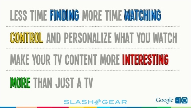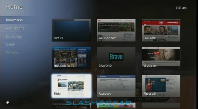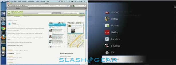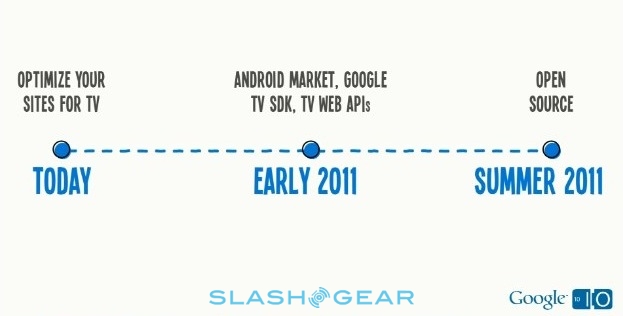 Google TV is based on Android, with the Chrome browser and full Flash 10.1 support, and you'll have Android Market access for things like Pandora's internet radio app. Google are also opening up the APIs for Google TV so that developers will be able to create webapps and standalone software for the system – such as YouTube Lean Back – as well as eventually open-sourcing the technology. Since Android 2.2 Froyo adds remote app installation users will be able to install new apps to their Google TV box from their desktop computer. Still, you won't be able to access the Android Market on Google TV until early 2011, and it won't be open-source until late 2011. You can sign up for more details at google.com/tv.