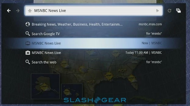 There's also a picture-in-picture style viewing system where you can have both a Google search and a live TV stream on-screen at the same time. It doesn't just have to be a search, either; you can view any webpage, and access a combined bookmarks system that incorporates your favorite channels and your favorite sites.