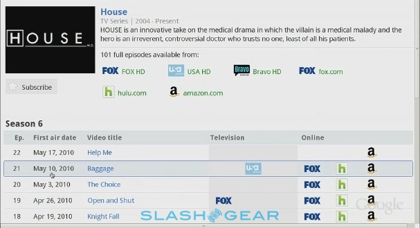 Type in a search query, however, for a show and you can also see online content as well as what's available through broadcast TV. For instance, a search for House brought up Amazon, Hulu and Netflix results, including options to stream content as well as buy it on DVD, and you can browse to the websites without having to change inputs on the HDTV itself. Google have worked with Amazon and Netflix to integrated things like the Netflix Instant Queue directly into the Google TV interface.