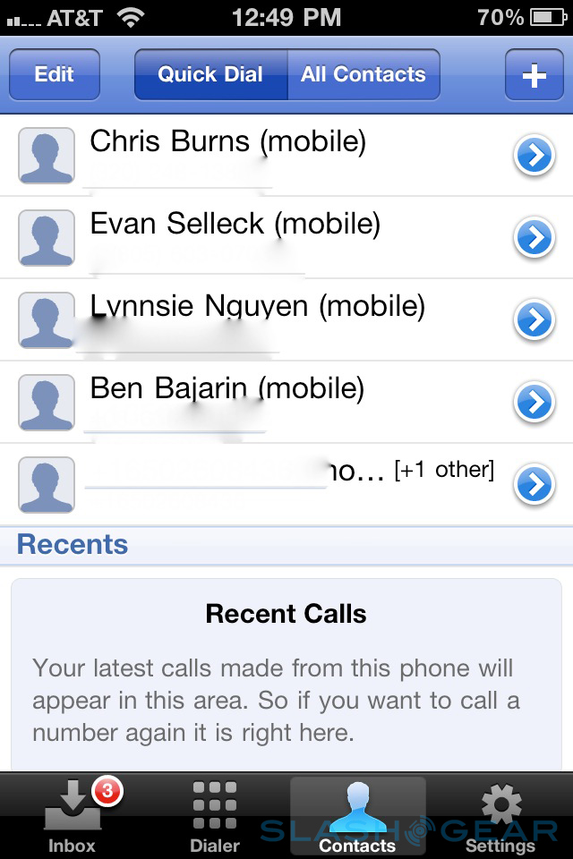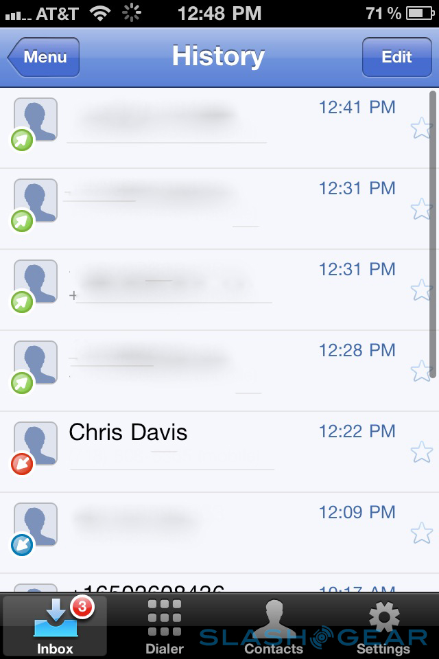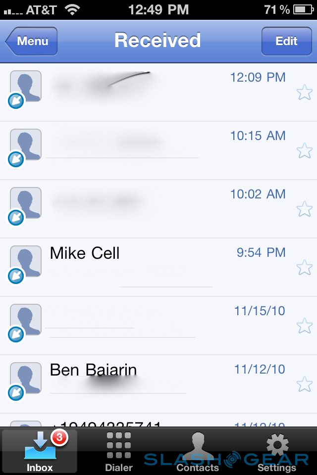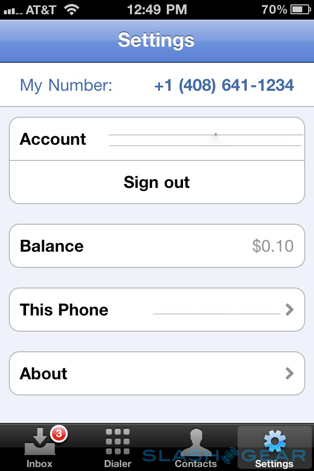 As for the dialer, it's obviously present. You can make calls from the iPhone, using your Google Voice number (which will show up on the person your calling's Caller ID as your Google Voice number, remember), as well as receive calls. You have a Settings menu as well, which will let you change some settings right there on the device, for the iPhone you're using Google Voice on.
