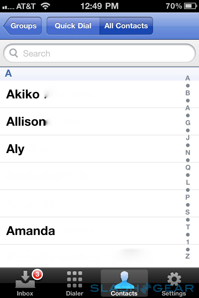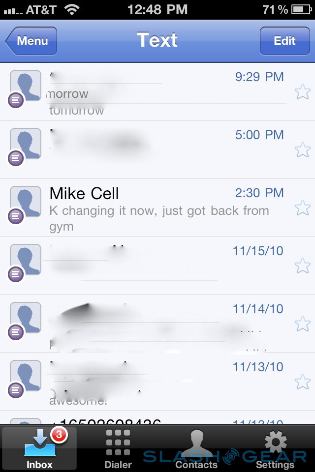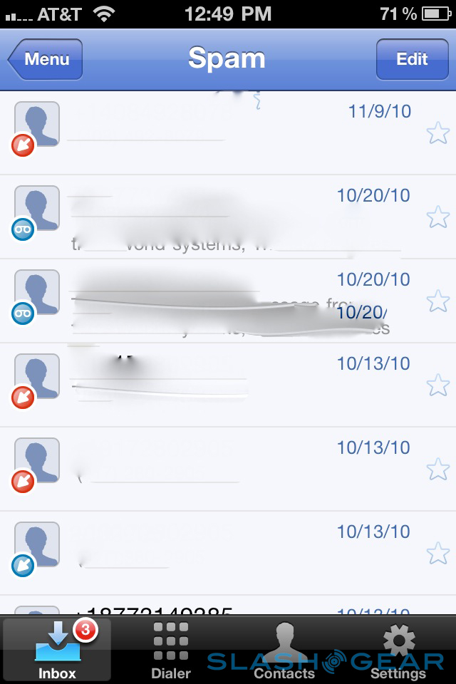 It didn't take us long to find, download, and install the official Google Voice for iPhone application. We were happy to find out that the application runs natively on the iPhone, which is a big plus in our book. As you can imagine, there's a few intricacies to the software that you're either going to love, or hate. For example, like a few different iOS-based applications feature now, you're able to just drag down the list of messages in your Inbox, and the application will immediately refresh, bringing any new messages you have waiting for you front and center.