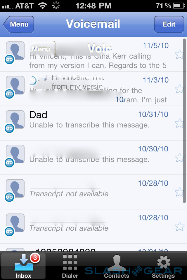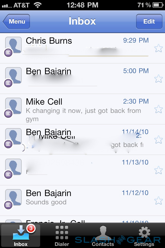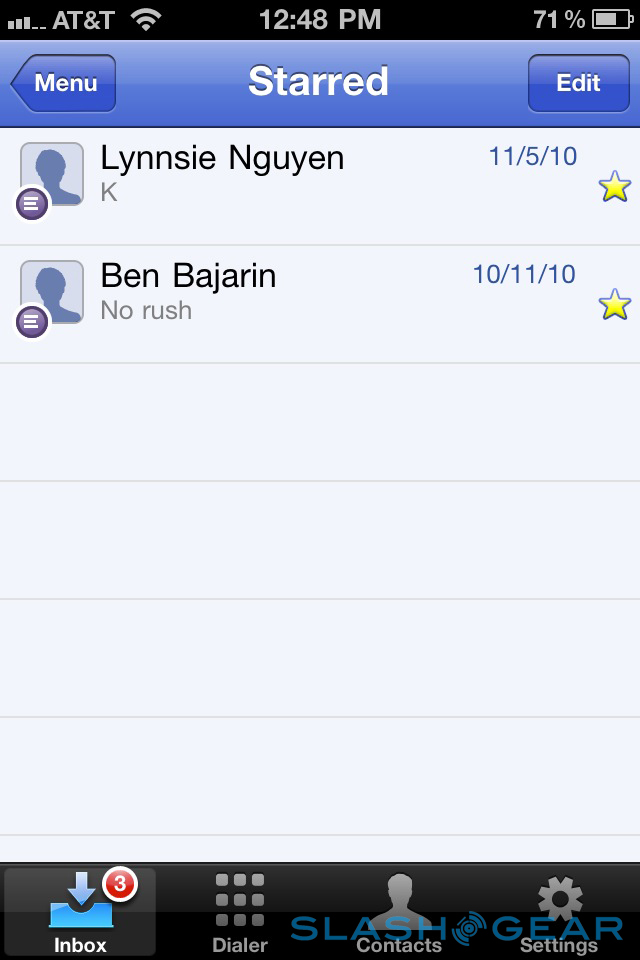 You have access to your main screen, which will show you a quick run down of new things happening, such as your Inbox and voicemails. You can also access starred messages, which are just messages that you've starred, so you can save for later. You can also read your history, so you can look back at what someone has said, or what you've said to someone else, as well as call information. Accessing your voicemail lets you read the transcription (if Google was able to make one), or listen to it, right form the iPhone.