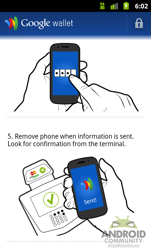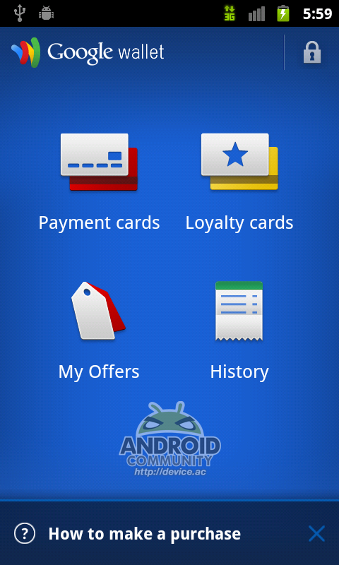 What you're seeing here is the Wallet application that's automatically added to your device once you've updated to version 2.3.7 Gingerbread on your Nexus S 4G. Upon opening this application for the first time, you'll be prompted to add a PIN number of four characters – numbers only. Once you've done this, that PIN is kept secret and the app (and its functions) can only be used by those who have that number. Inside the app you'll see a rather familiar view with the Google Wallet title up top next to a lock icon (to let you know that, aesthetically, you're secure), below which you'll find Payment cards, Loyalty cards, My Offers, and History. Below THAT there's a simple "How to make a purchase" guide that we recommend everyone take a look at before anything else.
