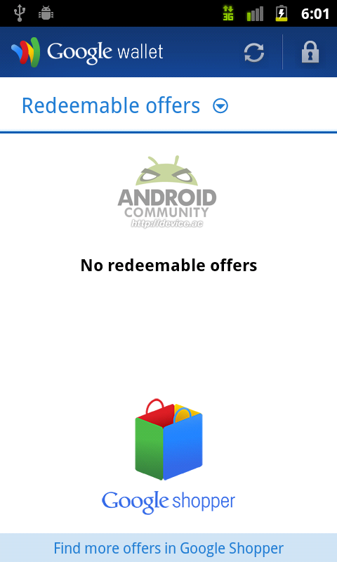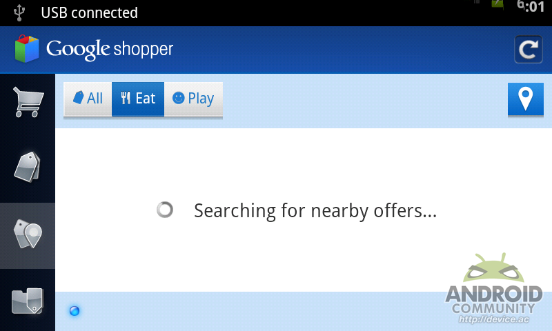 My Offers will contain coupons galore offered up by groups all around you, these coupons working like any other paper coupon would, having an expiration date, starting time, and value. You can look for Redeemable offers as well as browse through Used and expired offers. This part of the app connects with Google Shopper which we don't go into too deeply, but is able to be activated directly from the My Offers screen. Here you'll find offers by selecting (manually or automatically) your physical location, finding coupons around the area that you can redeem.