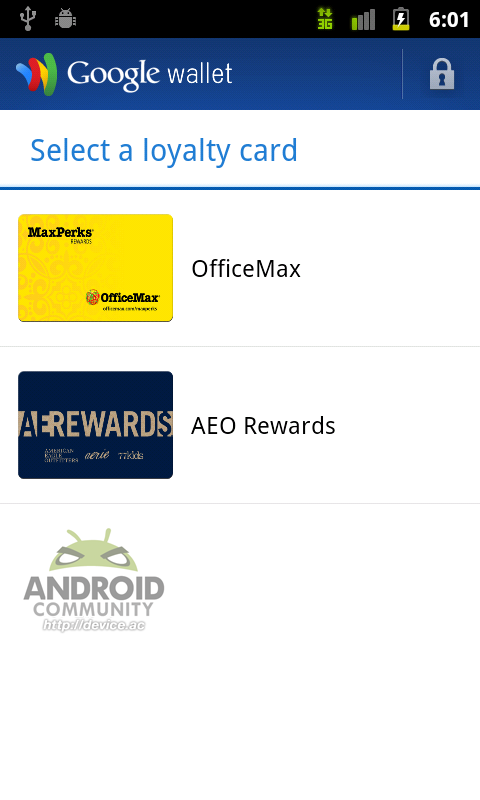 The Loyalty Cards screen contains a single PLUS sign the same as the cards in Payment cards did, only here there's some different options: AEO Rewards and OfficeMax. All cards, once entered correctly, have a button underneath them that allows you to simply activate or de-activate them. Just tap and go for it. You'll be able to select a default card from your Payment cards, everything else is selectable or works automatically.