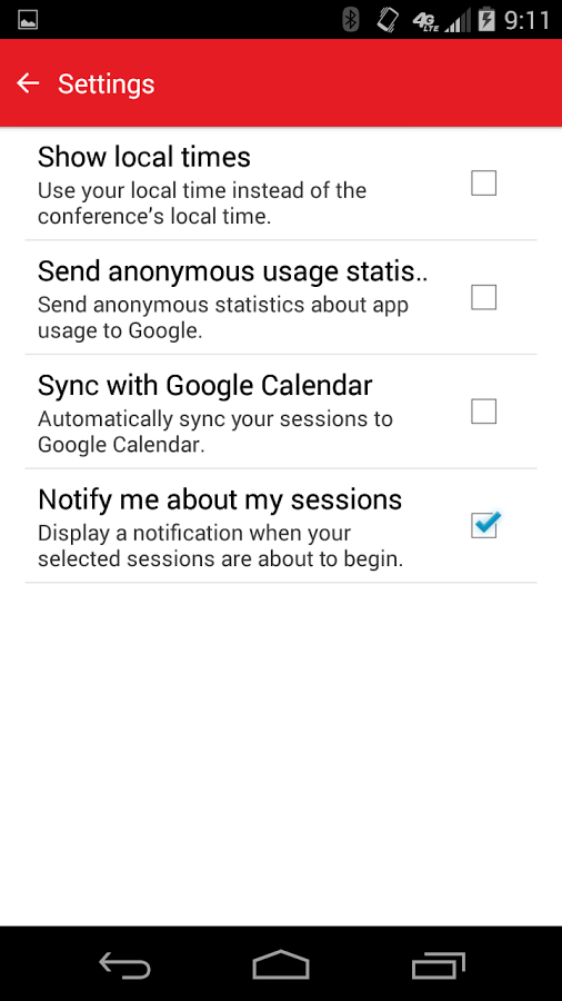 One interesting feature allows for the addition of sessions to your Google calendar. If you add an event to calendar, the app notifies you about 30 minutes before the session starts.