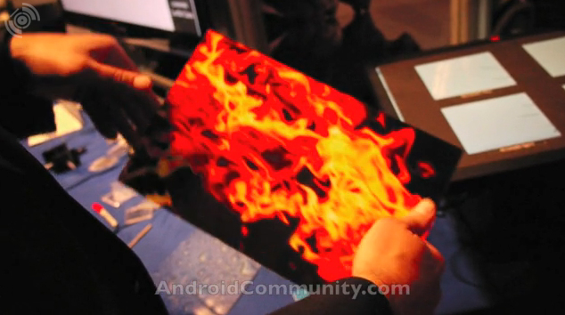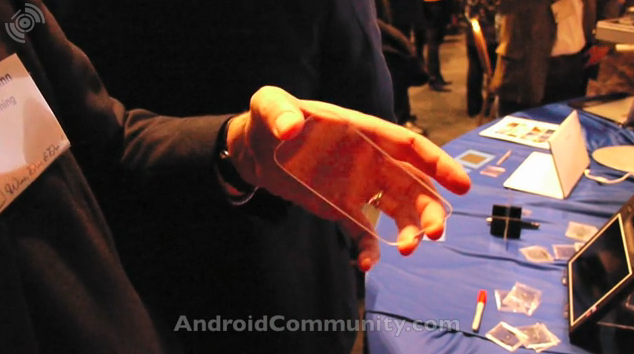 First, we get to see a prototype hand-sized piece of Gorilla Glass where a there's a bend in the glass.