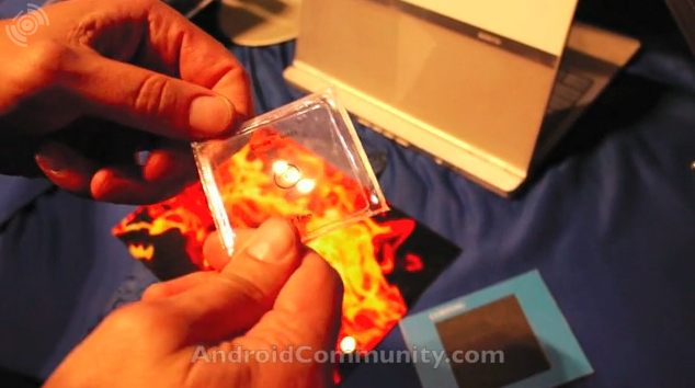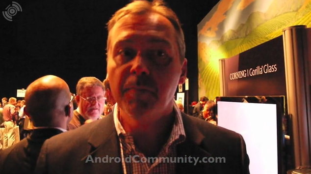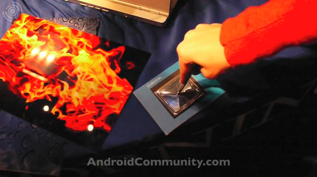 Finally, he shows off a panel of Gorilla Glass with a design behind it which he notes would be optimal for a laptop cover (either custom or straight out of the box) that could, again, differentiate whichever brand plans on using it.