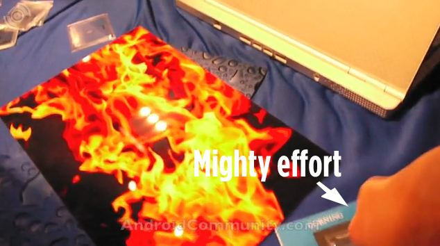 Finally, they reach the Gorilla Glass, a 1.1-mm thickness just like each of the pieces of glass before it. The man presenting the Glass does admit that some people at PEPCOM had been able to break the glass upon HEAVY pushing, so Vince does attempt to do so as well "for our readers" – like a boss. But alas, the glass does not give way. But I guess that's also good news!