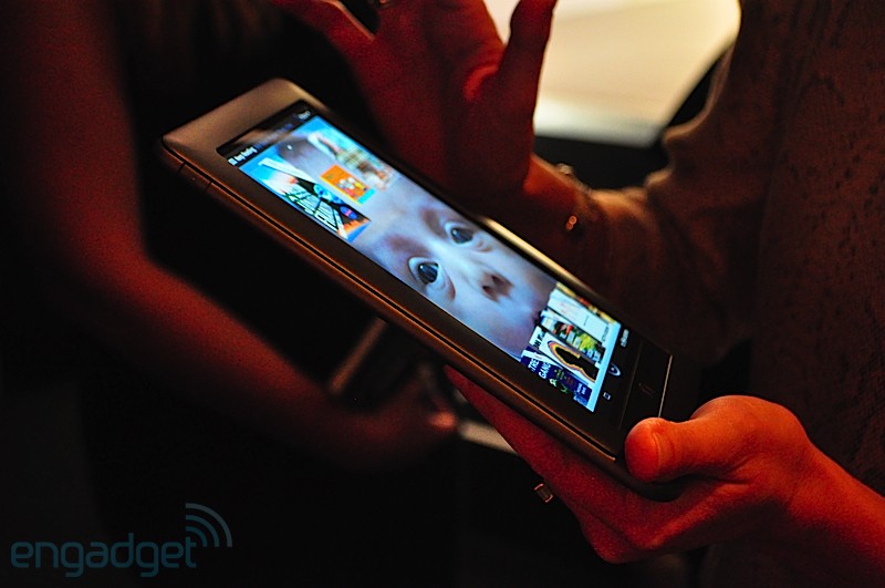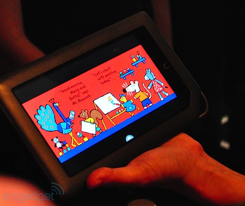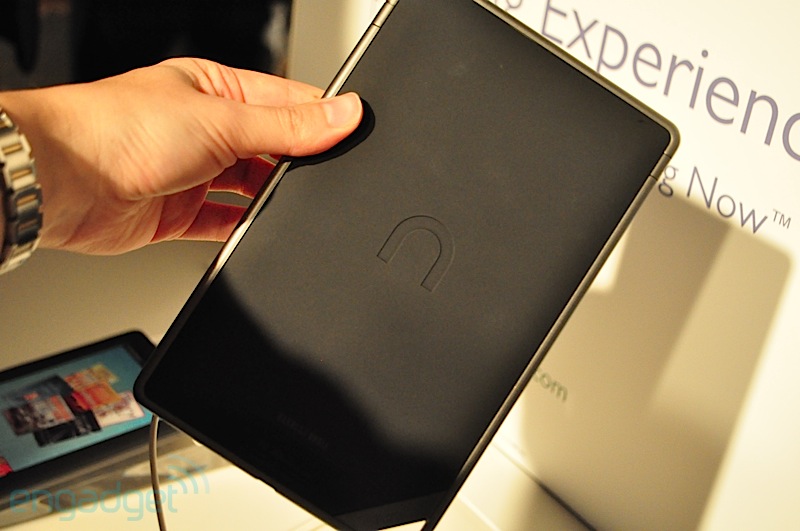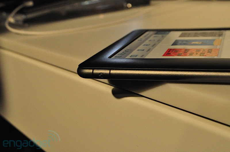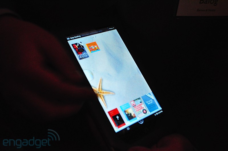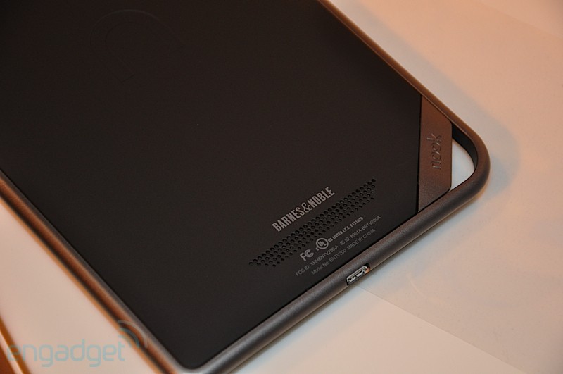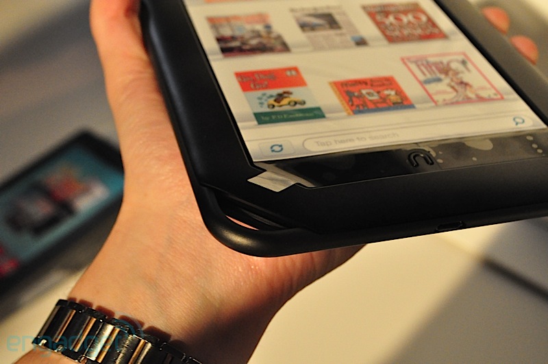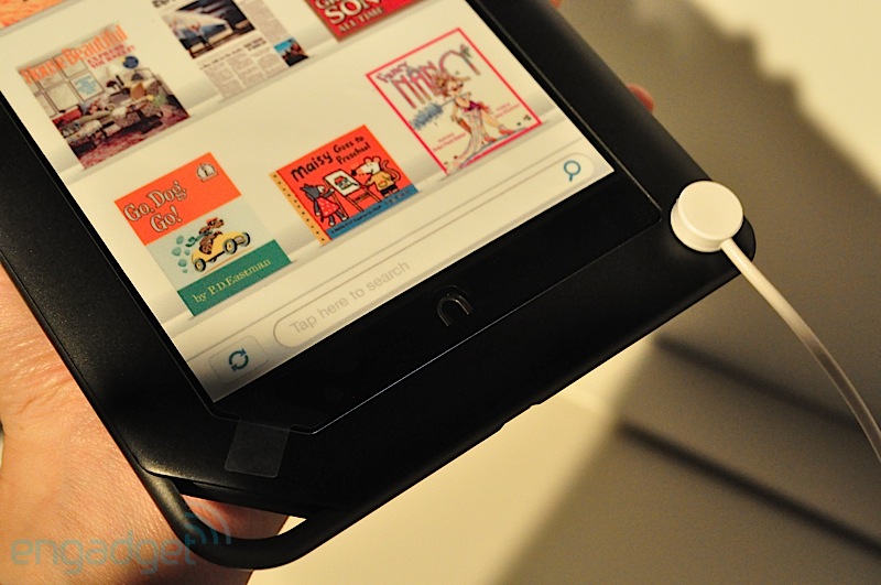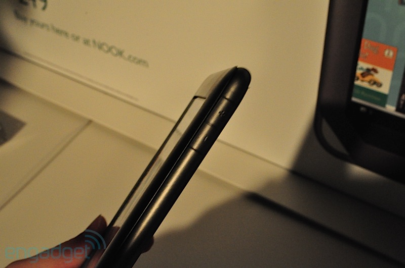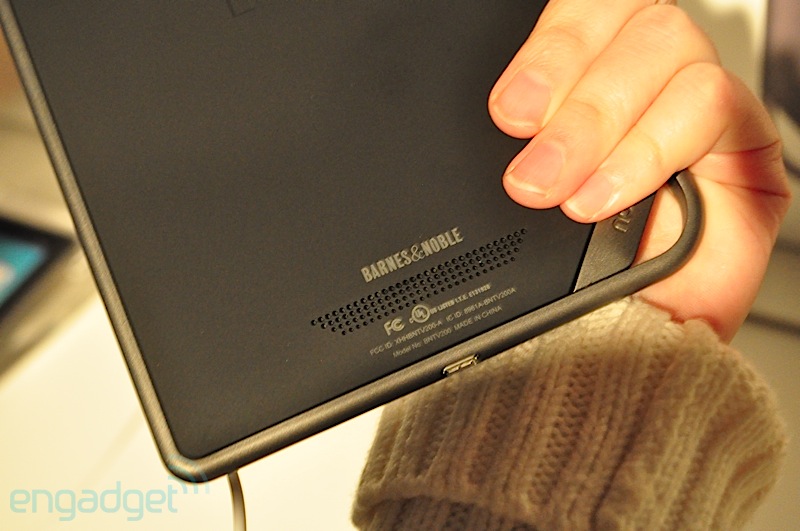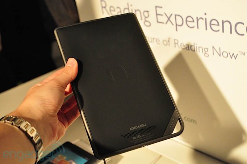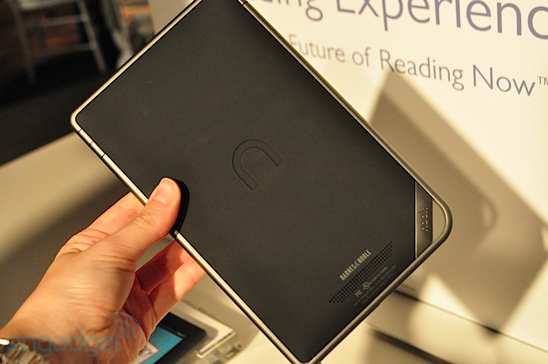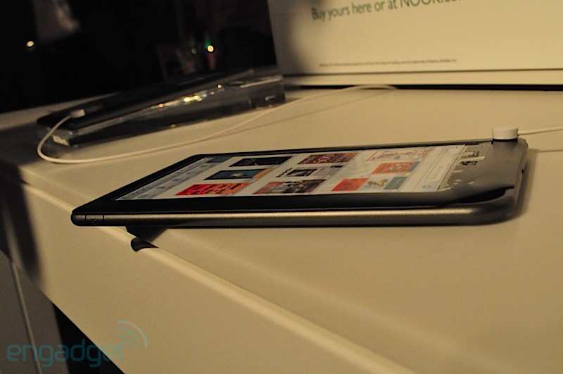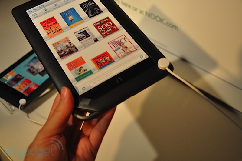 Two things: let's talk about what it feels like to use this device, AND, lets look at the full press release on the Nook Color just released by Barnes & Noble a moment ago. Our pals at CrunchGear are there at the event with commentary, Engadget too, plus a couple other friends are sure to pop up along the way. It's thin, it's got a rubbery back, and it's got a loop to put a chain through. It's nice to hold, very bright and easy on the eyes, and also you can read books on it!