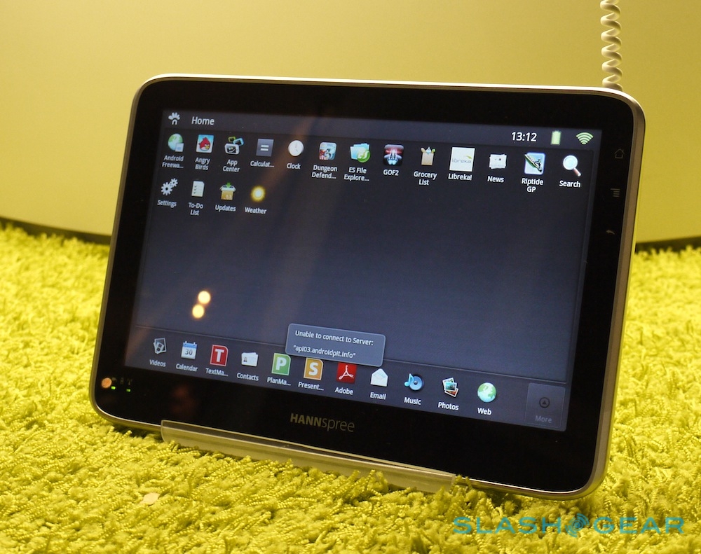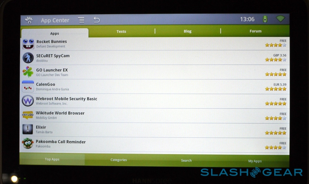 Perhaps the biggest issue is the absence of Android Market support. The SN10T1 is preloaded with AndroidPIT's App Center, an alternative download store, but since the Hannspree doesn't tick all of Google's check-boxes for phone functionality it can't have the official Android Market. Meanwhile, because it falls short of the 1280 x 800 display (and twin cameras) that Android 3.0 Honeycomb mandates, it can't run the tablet-centric OS either.