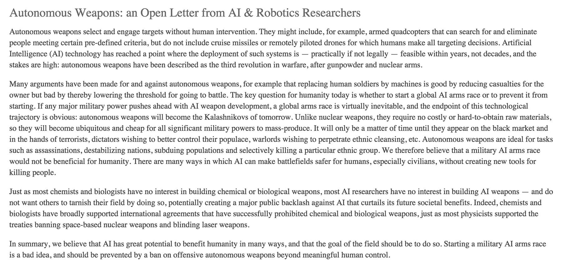 "We believe that AI has great potential to benefit humanity in many ways," says the paper, "and that the goal of the field should be to do so. Starting a military AI arms race is a bad idea, and should be prevented by a ban on offensive autonomous weapons beyond meaningful human control."