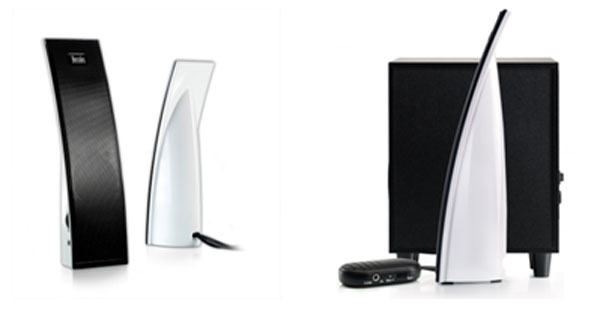 The first is the XPS 2.0 10 and 2.1 20 Arc White speakers. These are made in an arching style and the only difference between the two sets is that the 2.1 has a subwoofer included. The 2.1 set will cost $34.99 and the 2.0 set will sell for $29.99. The Hercules XPS Sound Bar is a speaker that uses the USB port for connectivity and is made to clip onto the screen of a netbook or notebook. It will ship soon for $49.99.