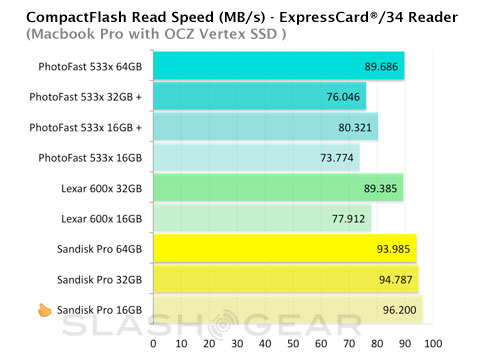 Second place is jointly held by two cards, the regular-speed 533x 64GB PhotoFast and Lexar's 600x 32GB. Data copied at a rate of 90MB/s from the ExpressCard to the SSD. A similar outcome was also observed using the FireWire reader; the pair performed ahead of their competition, but still dropped about 10 MB/s when using the FireWire interface.