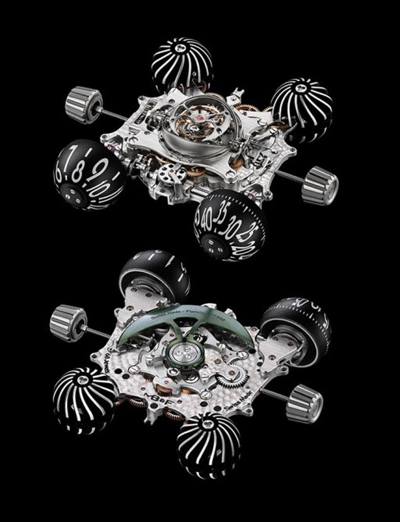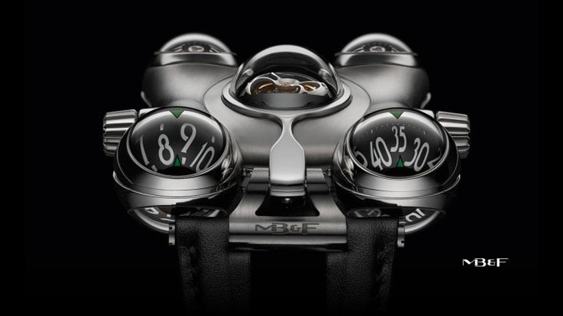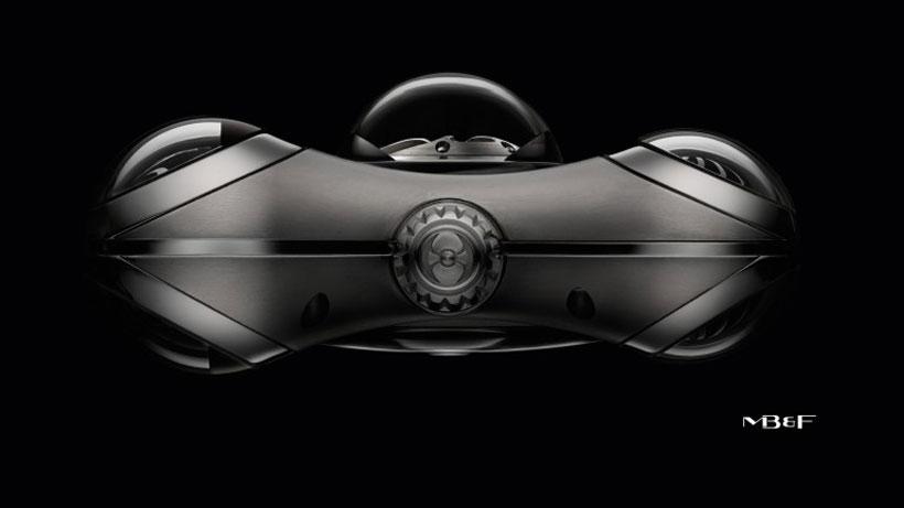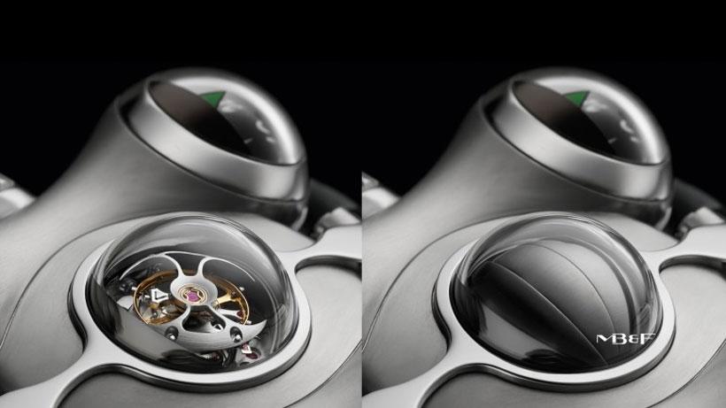 The watch is a marvel of mechanical watch making. The spaceship the cartoon character flew around in was called the Comet and some of the design touches from that ship are found in the watch. HM6 was in development for three years by MB&F with David Candaux Horlogerie Creative. The watch has 68-jewel movement with a 60-second flying tourbillion behind a semi-spherical metal shield.