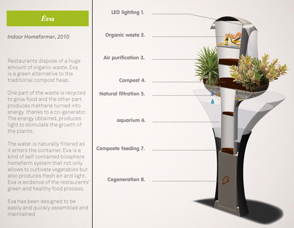 Basically, it's a sustainable-minded idea, which always makes me smile a little bit, but he kinda glosses over the steps of composting and collecting methane to generate power for this thing, both of those processes are the kind that really need a level of critical mass to get the right biological chain reaction going.The idea here is to locally reuse organic waste, reusing those resources instead of shipping them either to landfills or grinding them up and sending them down the sanitary sewer. It'll probably take something more along the size of a standard appliance (fridge, oven etc.) or larger to really take advantage of this kind of system. It's not something that would be significantly useful with the standard waste stream coming from an average family, more like something that could go into arcologies.