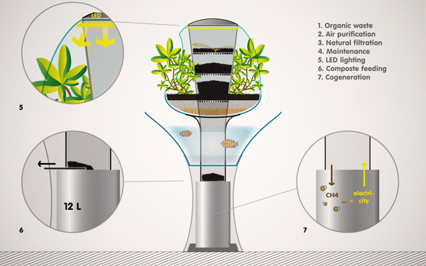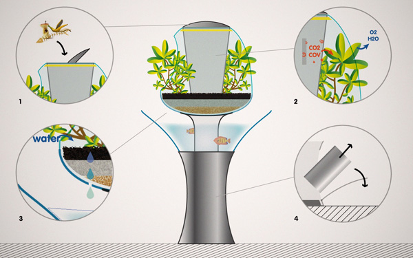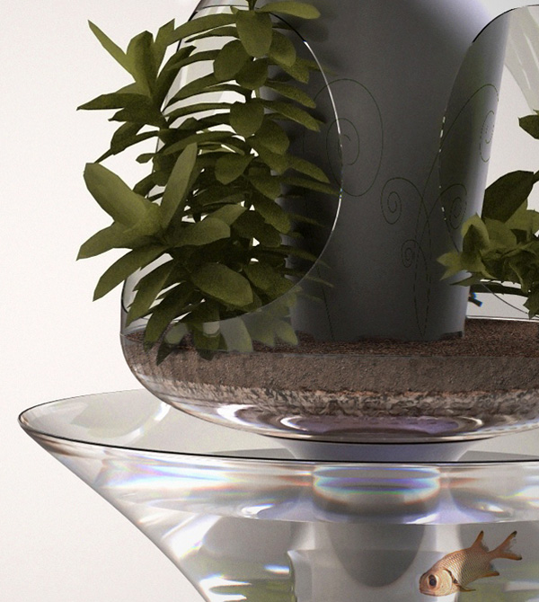 Designer, François Hurtaud has an idea. This idea is tiny ecospheres in our kitchens and living rooms that dissolve the organic garbage we dispose of into a tiny garbage ecosystem replete with fish and plants. The first thing that came to mind when I saw the image was, clean lines and cool fishbowls. It looks like something the Jetsons would have had in their home. But it has some flaws in the design.