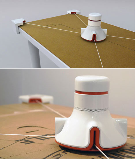 While the glossy device in the image above is merely a concept render, DK did put together a working prototype. Made from bits of remote-controlled cars, plotters and other recovered gadgets, you can see the prototype in action in the video below; if you want to skip to the action, start watching from around 8:35.