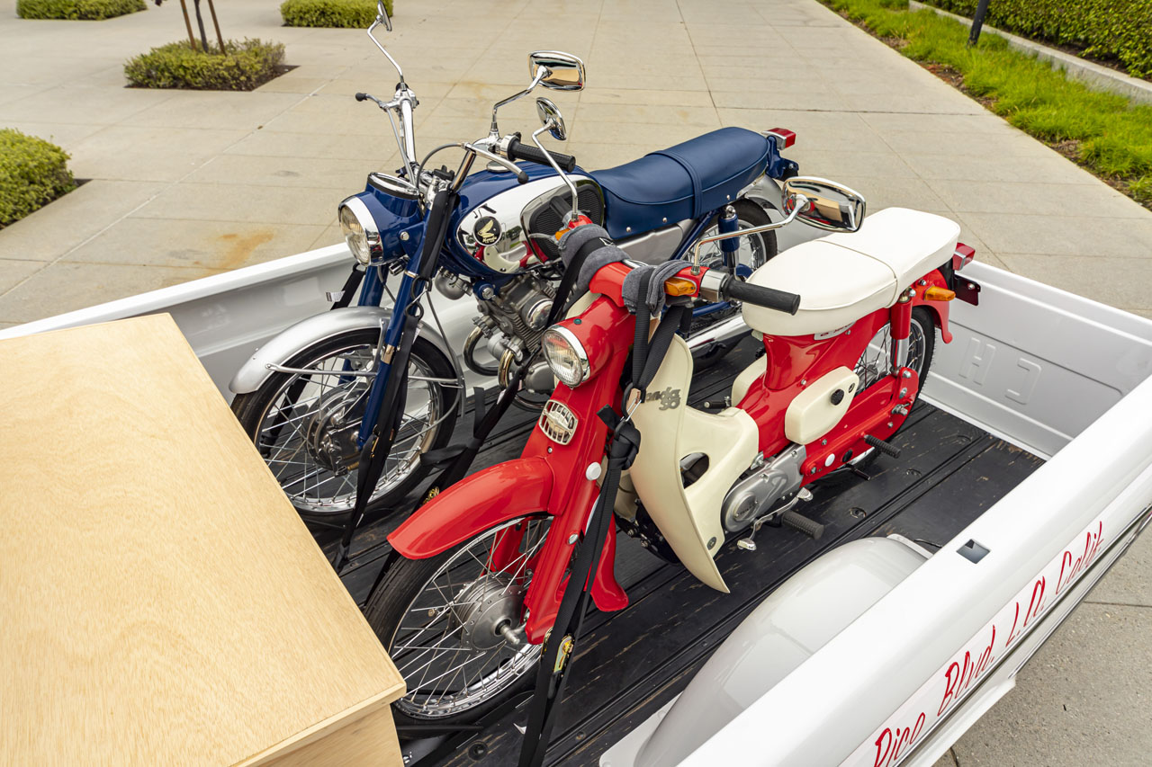 The little scooter on the left side of the truck bed is a 1965 Honda 50 known as the Super Cub in other parts of the world and is credited with putting Honda on the map in the early days. The bike has a 49cc single cylinder engine and 3-speed semi-automatic transmission with centrifugal clutch.