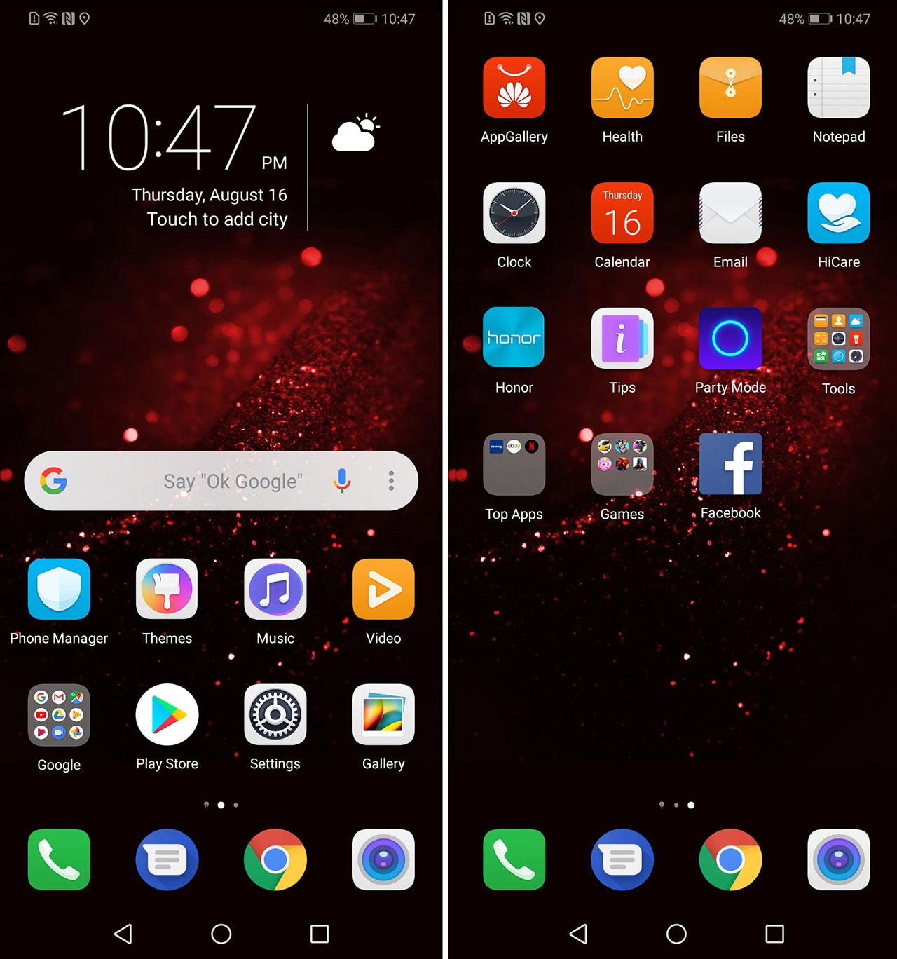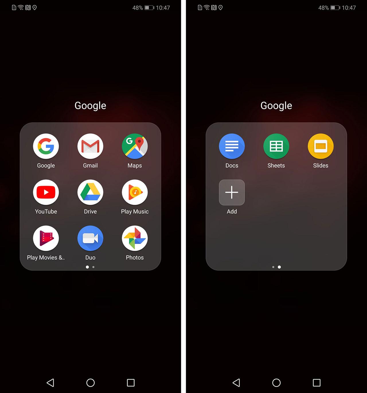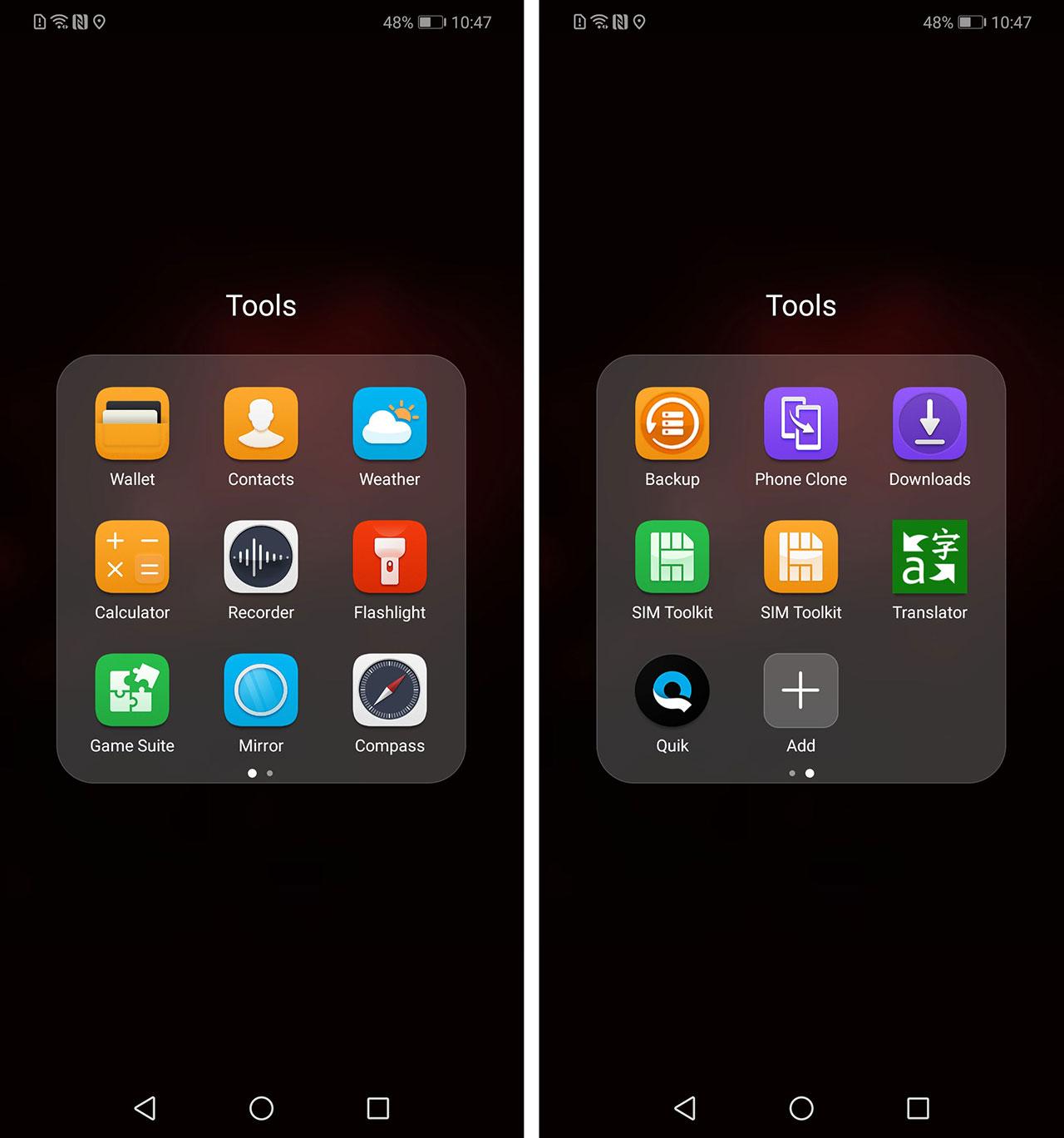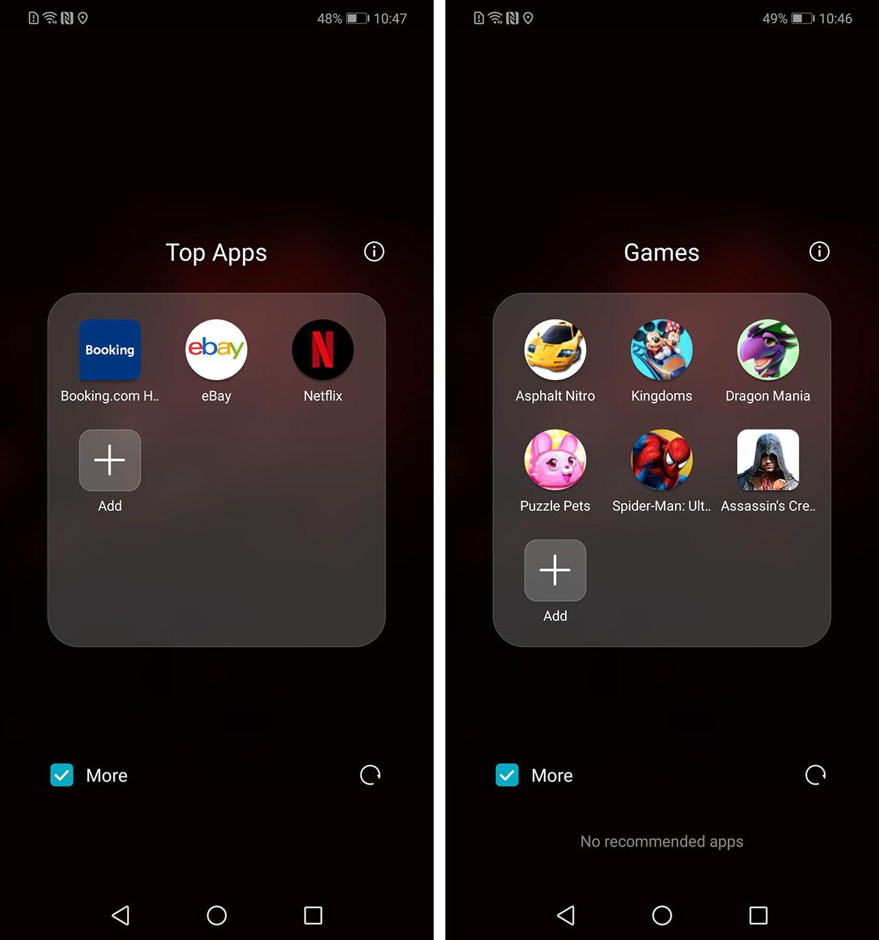 Above you'll see the phone's home screens and folders as they appear right out the box. There are a significant amount of apps here that I'd end up deleting immediately – but there are quite a few that I'd be glad to have right away, too. There's an app called Game Suite (more of a drawer, really) that contains all the phone's mobile games*. In this app, made by Huawei, users will find some of the only features that make this smartphone a Gaming Smartphone. *In the app you'll find the games Honor recognizes as games (Hearthstone and PUBG, for example) plus a button that adds any other app you choose.