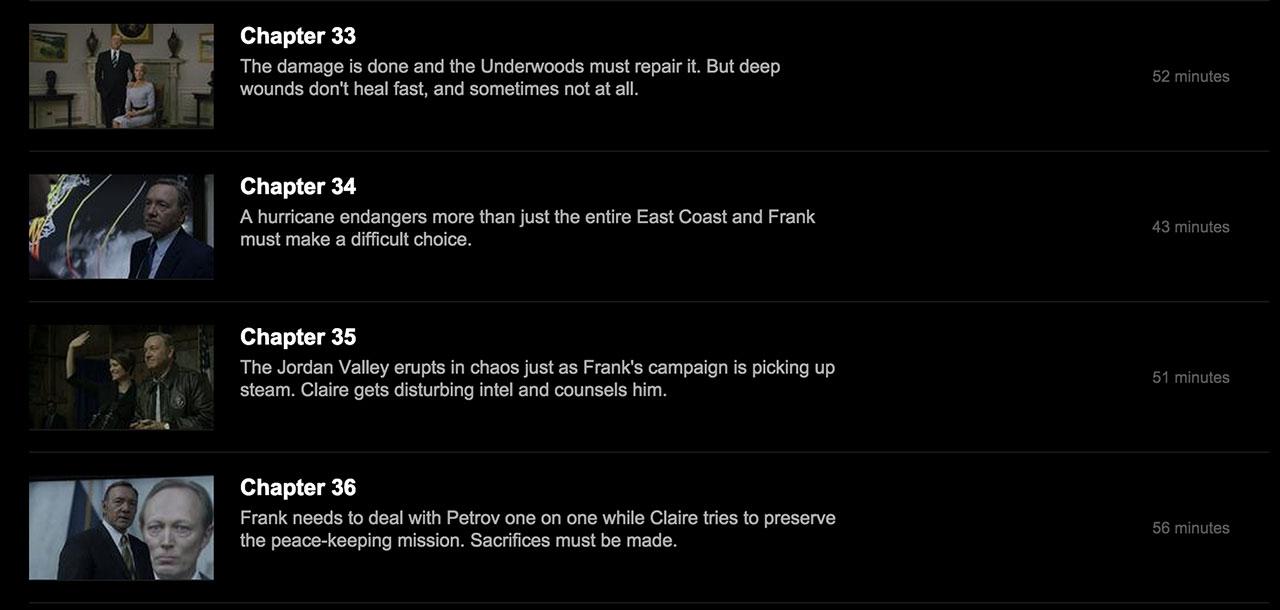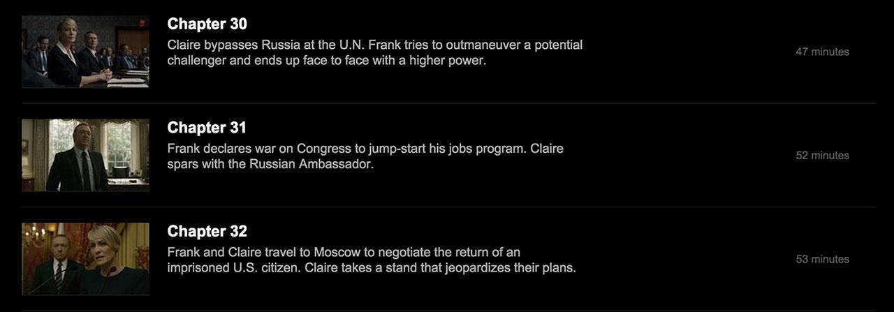 This season's description reads as follows: "President Underwood fights to secure his legacy. Claire wants more than being First Lady. The biggest threat they face is contending with each other."
