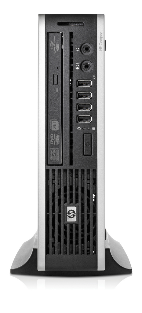 As for the compact desktop, that's the HP Compaq 6005 Pro Ultra Slim, with a choice of various AMD Sempron, Athlon or Phenom CPUs along with up to 8GB of RAM and ATI Radeon HD 4200 graphics. SSD storage is optional, while ports include 10 USB 2.0 and DisplayPort.