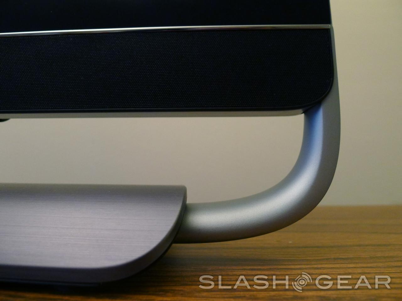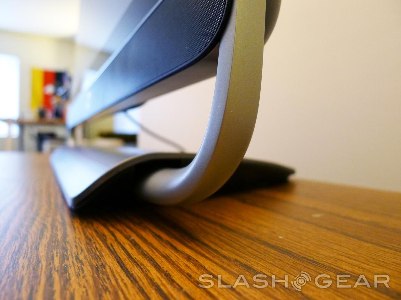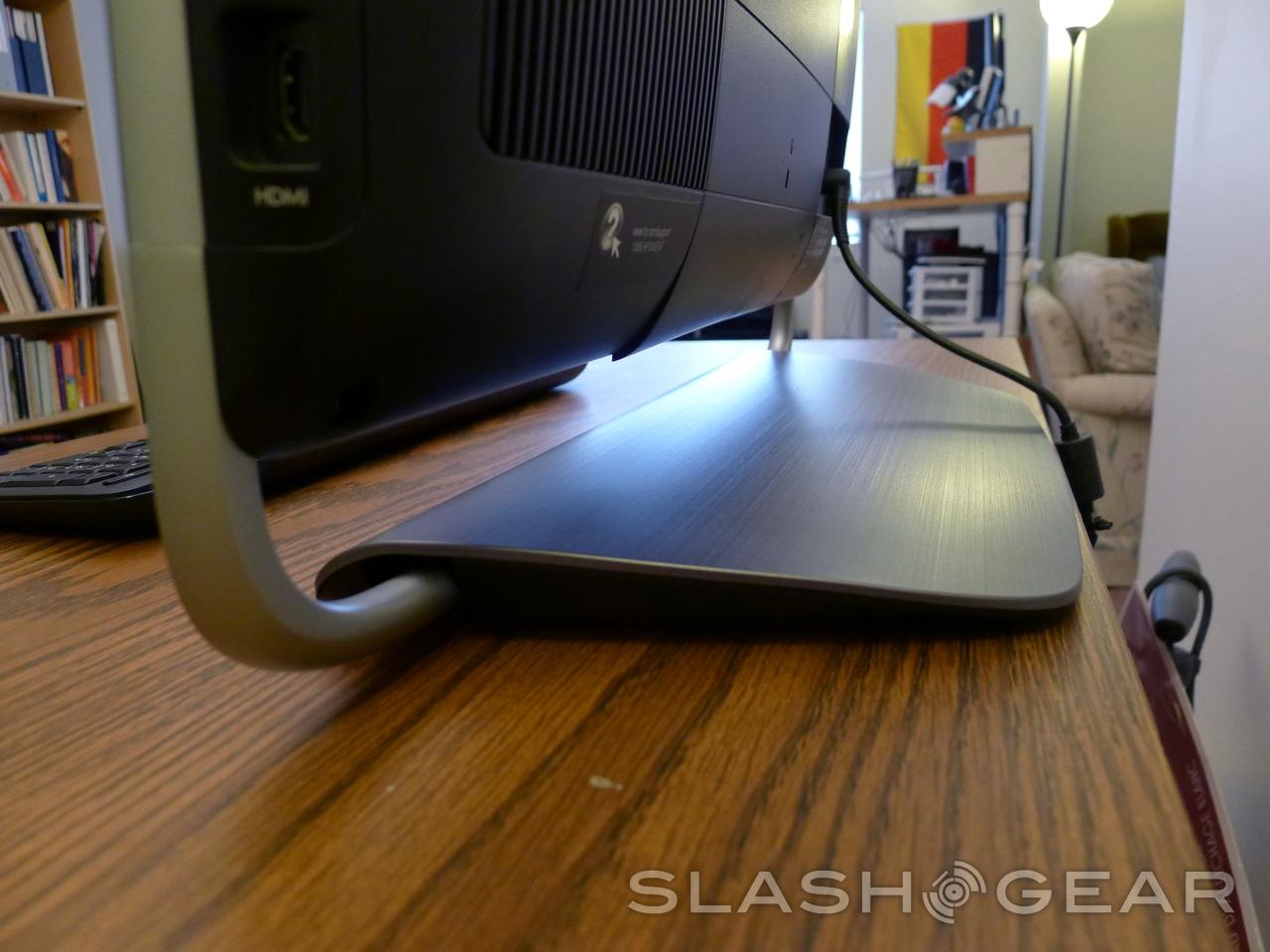 The ENVY 23 TouchSmart sits on a big base, which takes up most of the width of the computer and leaves a giant footprint on any desk. Unlike the iMac, and even one of Vizio's latest all-in-one offerings, HP's newest machine doesn't have a small base in the middle. However, that's mostly because the entire panel is supported by two beams on the sides, which then connect to the base, providing a frame-like structure to the computer. I have to say, though, that the base and the two supporting beams are fairly sturdy. While you can easily adjust the angle of the display without much effort, playing around with the touchscreen doesn't affect the computer's stance — it stays still extremely well, even through marathon sessions of tapping and scrolling.