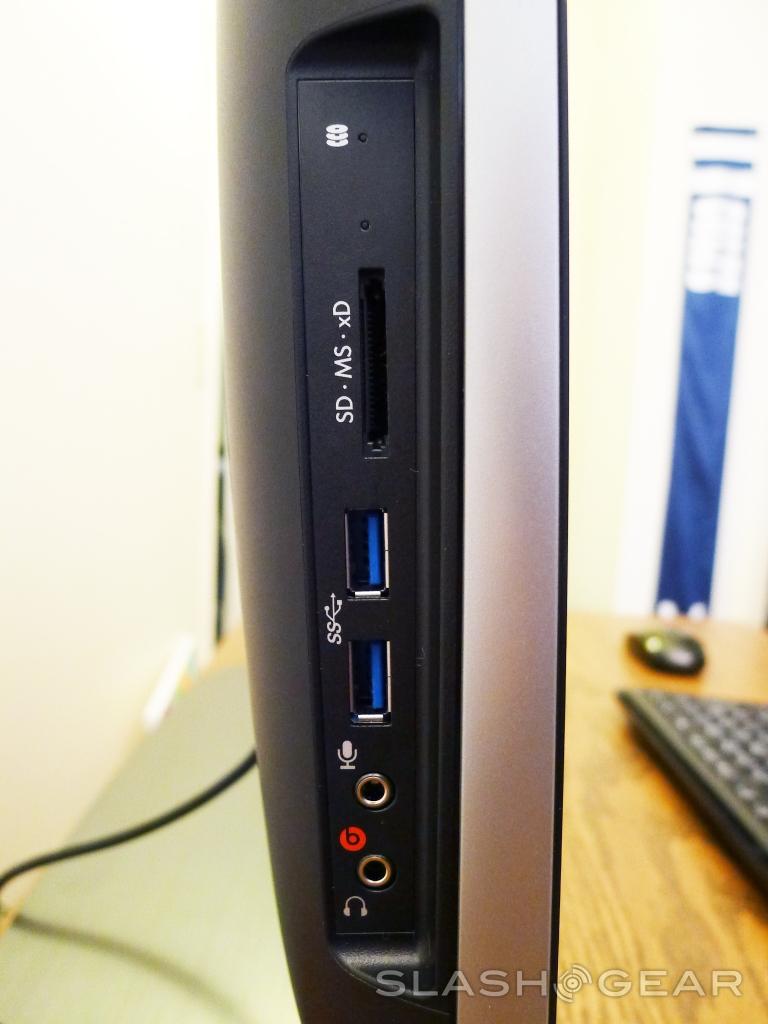 As far as the placement of all the ports, I have to say that it's all pretty scattered. It's nice to have two USB ports, the SD card slot, and the audio jacks on the side for quick and easy access, but having the HDMI port all by itself on the right side doesn't quite make sense — it seems it would make better sense if it was with all of the other connectivity options on the back. We're also not sure why HP didn't include more USB 3.0 ports on the back. Those with a USB 3.0 external hard drive may be disappointed by this, since you'll be stuck with plugging it in on the side and having a USB cable stick out the whole time.